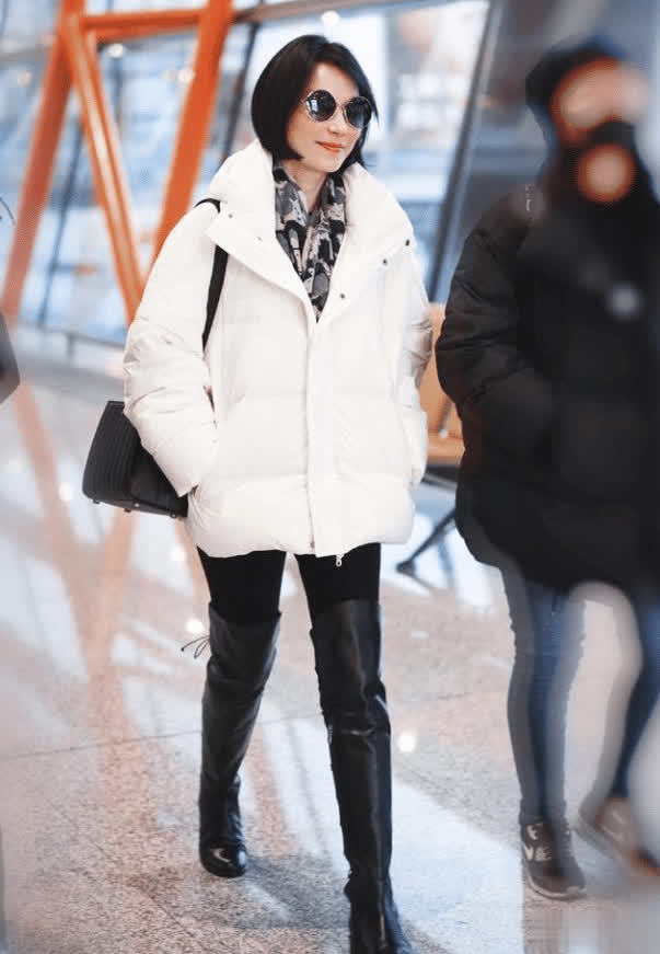 俞飞鸿经常在日常生活中尝试羽绒服的搭配,而她每一次都会把羽绒服穿出不同的风格,就像下面这件白色的羽绒服款式也很简约,但是她却没有搭配雪地靴,而是换成了长筒靴。