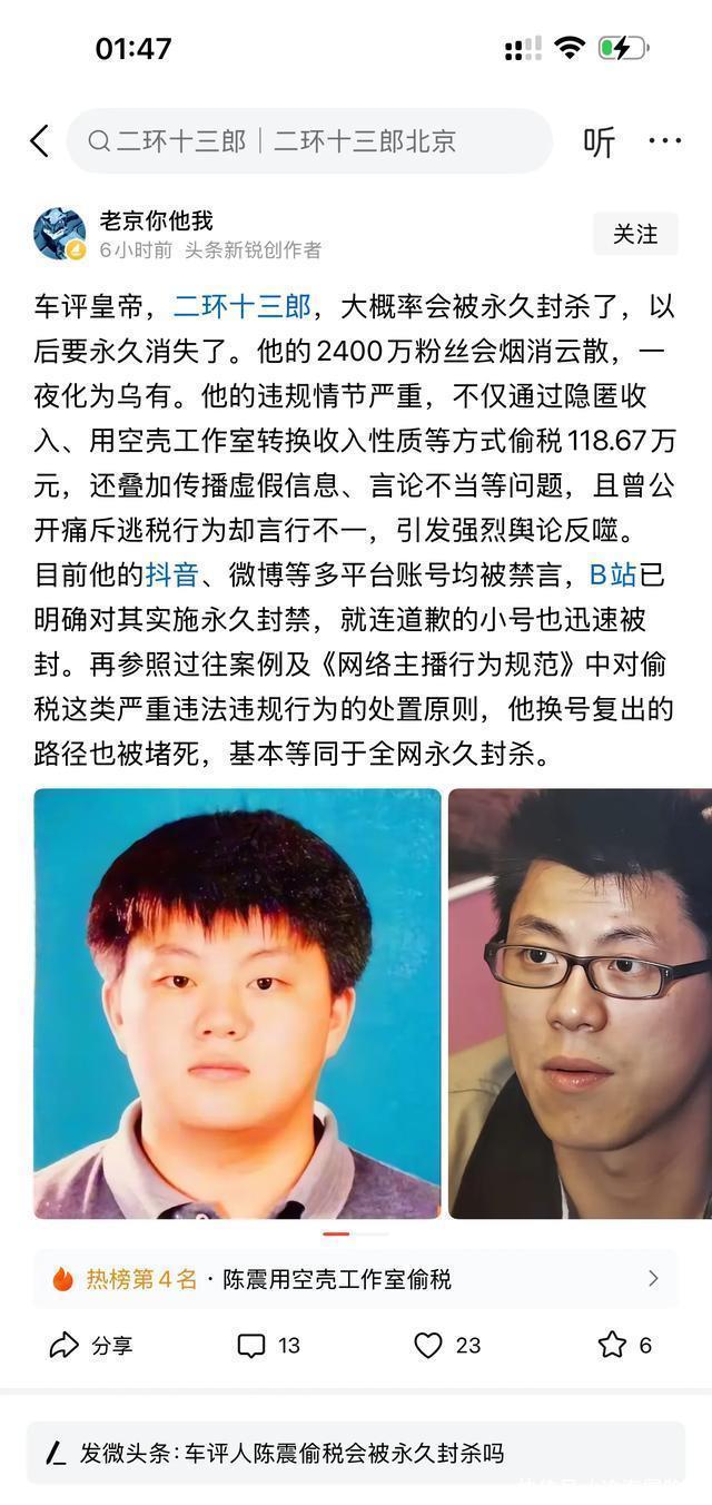 四、最可惜的不是账号没了,而是信任没了 账号封了还能再注册。 商业广告没了还能再谈。 唯独“信任”这东西,一旦掉进水里,就沉底了。 未来他再说哪款车好、哪个配置真香, 你可能都会条件反射地想: “这是不是又要靠嘴挣钱了?” 公众人物最不能丢的,是可信度。 一旦碎了,再精心拼贴,也有裂痕。 五、他其实不是被绊倒,是自己把油门踩太死 复盘陈震这两年的表现,你会发现一个规律: 别人都在“走红”, 他是在“走火”。 说话越来越冲, 立场越来越偏, 人设越来越飘, 甚至连车评都开始变成情绪表达。 就像一辆马力十足、没有限速、方向盘也不稳的车, 总有一天会失控。 他真正的问题,是一直以为自己不会翻。 六、惹怒大众的不是金额,是态度 247万,对一个月入百万的人来说算不上“重击”。 但为什么全民都在骂? 因为这件事踩中了普通人最敏感的点: 我们这么认真缴税,你赚这么多反而想着绕开? 这不是金额问题, 这是态度问题。 是“规则对我无效”的那种傲气, 让所有人都瞬间失去好感。 七、如果人生是一条赛道,那他这次是真的冲出轨道了 他最出名的故事是“十三分钟跑完北京二环”。 那时候所有人都觉得这是天赋,是胆识,是传奇。 但现在再回头看, 这更像一个隐喻: 他一直高速狂奔,却从不看前方有没有悬崖。 如今掉下去了,不是命不好, 是……本来就在往悬崖开。 **结尾: 有些人不是被风暴击倒,而是自己制造了风暴** 陈震跌得快,不是因为他不努力, 是因为他把努力全部放在“赚钱”上, 却没放在“做对的事”上。 规矩不是束缚, 而是护栏。 护栏你越过去了,就不是自由,是坠落。 今天发生的一切, 不是突发事件, 而是陈震自己写的剧本终于演完了。 吃瓜到此结束。 散。
